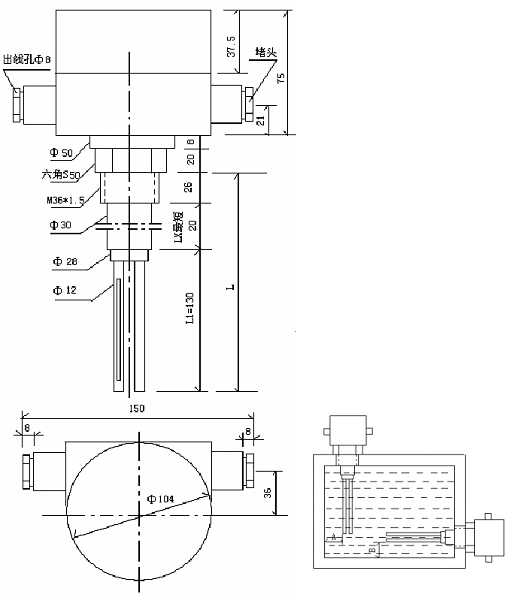 L1”長(zhǎng)度范圍130mm須全部浸入油中,并且電極距離油箱壁“A”及“B大于3mm以上。