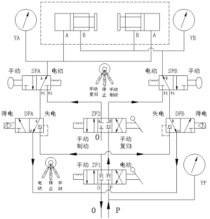 手動制動:電磁閥在失電的狀態(tài)下,方可轉(zhuǎn)為手動操作。至手拉閥SFA、SFB、轉(zhuǎn)閥ZF1于手動狀態(tài),當滿足機組停機條件時,轉(zhuǎn)閥ZF2轉(zhuǎn)到手動制動狀態(tài),使氣體進入制動腔,制動器動作加速機組停機。
